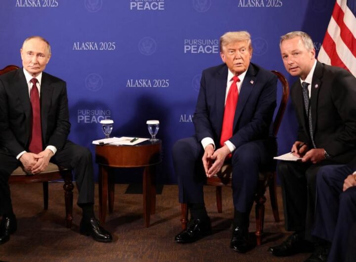 El presidente de Estados Unidos, Donald Trump, y el presidente de Rusia, Vladimir Putin, sostienen este viernes...